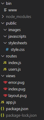 - views는 템플릿을 담고 있다. (나는 pug로 설정하였기 때문에 .pug 파일을 담고 있다.)