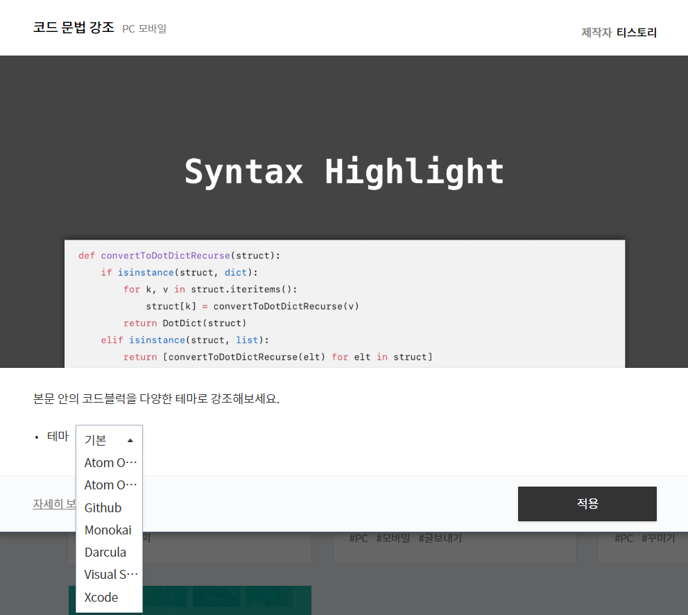 만약 업로드할 코드블럭의 테마를 변경하고 싶다면,