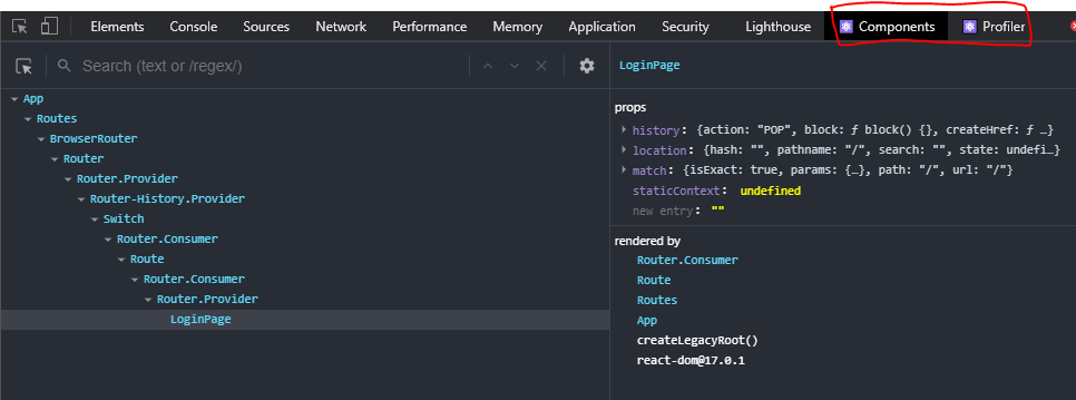 설치후, React 프로젝트를 실행하고 개발자 도구를 열면 끝에 React를 컴파일을 도와주는 탭 두개가 추가된 것을 확인할 수 있다.