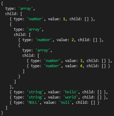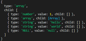 [1, [2,[3, 4]],'hello', 'world', null] 의 값과 type, value, child의 구조를 갖는 Object를 만들었다고 했을 때, 각 명령어에 따른 출력은 다음과 같다.
